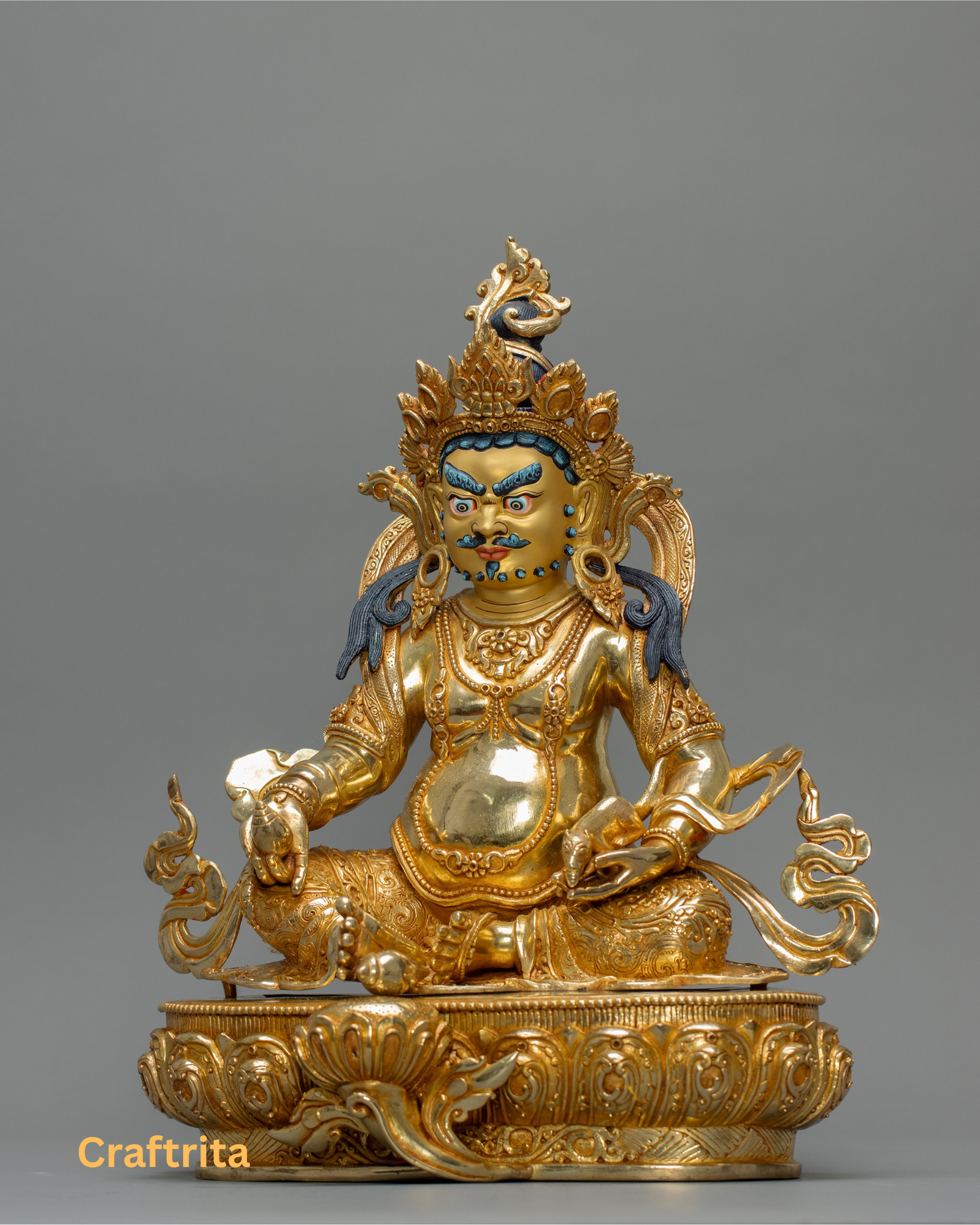 Invite wealth, abundance, and positive energy into your home or meditation space with this Dzambhala Statue, handcrafted in Nepal. Dzambhala, revered as the Buddha of Wealth in Tibetan Buddhism, is believed to attract prosperity, remove financial obstacles, and bring fortune and positive energy. Made from a solid copper body and finished with 24K gold plating and traditional fire-gilding, this statue radiates sacred energy and timeless craftsmanship.