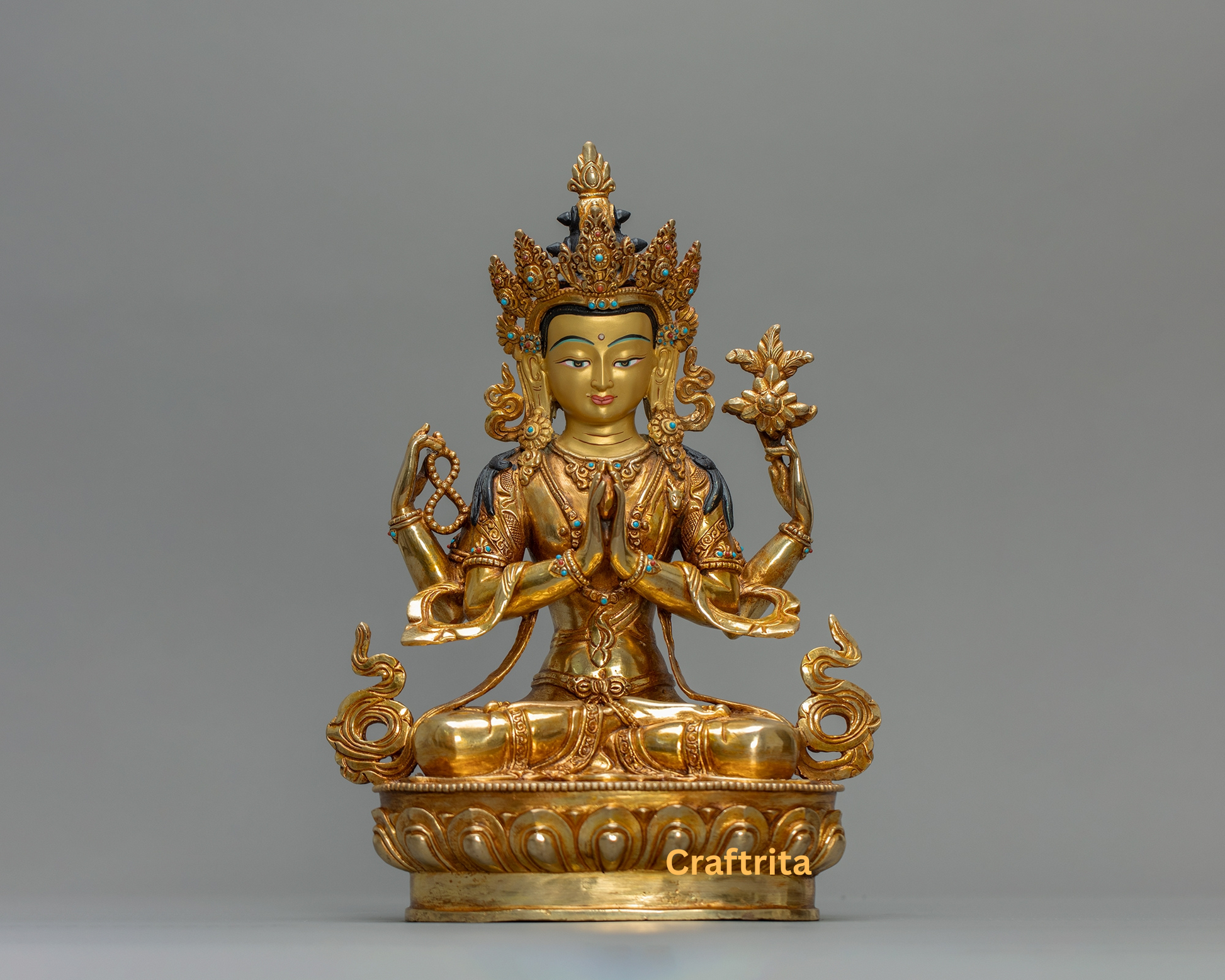 Chenrezig Statue (Avalokiteshvara) 4.2kg – Handmade in Nepal | Copper with 24K Gold Plating & Fire Gilding | Tibetan Buddhist Art & Spiritual Home Decor