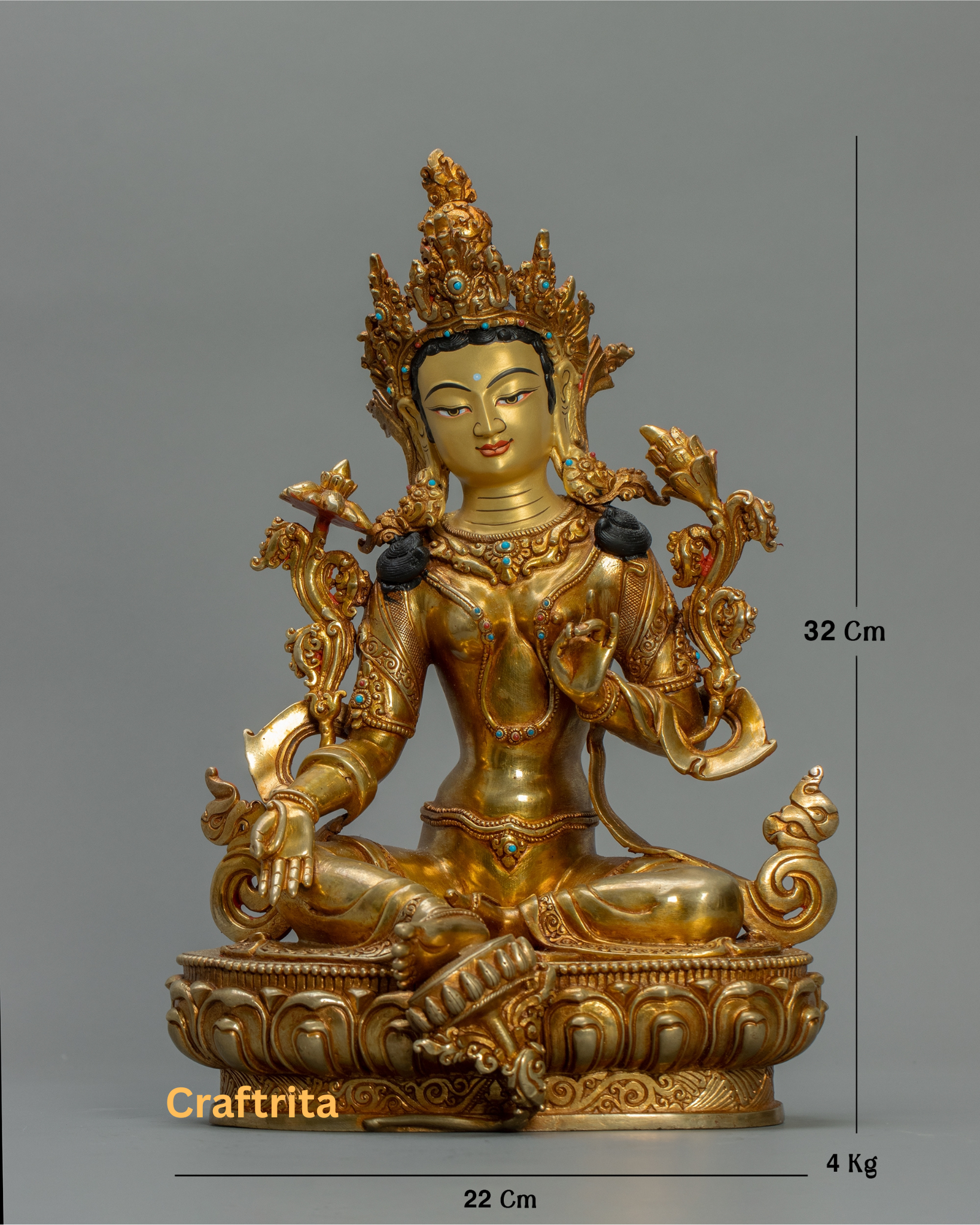 nvite compassion, protection, and spiritual harmony into your home with this exquisite Green Tara Statue, handcrafted in Nepal. Known as the Bodhisattva of Compassion and Protection, Green Tara is believed to remove obstacles, offer guidance, and bring courage and serenity to those who honor her. Crafted from a solid copper body and finished with 24K gold plating and traditional fire-gilding, this statue radiates sacred energy and timeless beauty, making it a meaningful addition to meditation spaces, Buddhist altars, or spiritual décor collections.