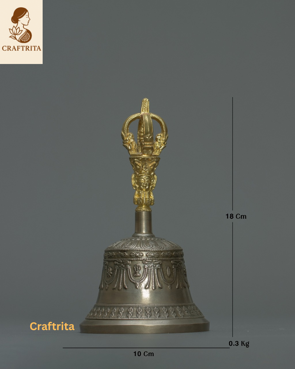 🔔 Bell: 18 cm (H) × 10 cm (W) | 7.1 inches × 3.9 inches | 0.3 kg (0.66 lbs) | Bronze body with gold-plated copper handle