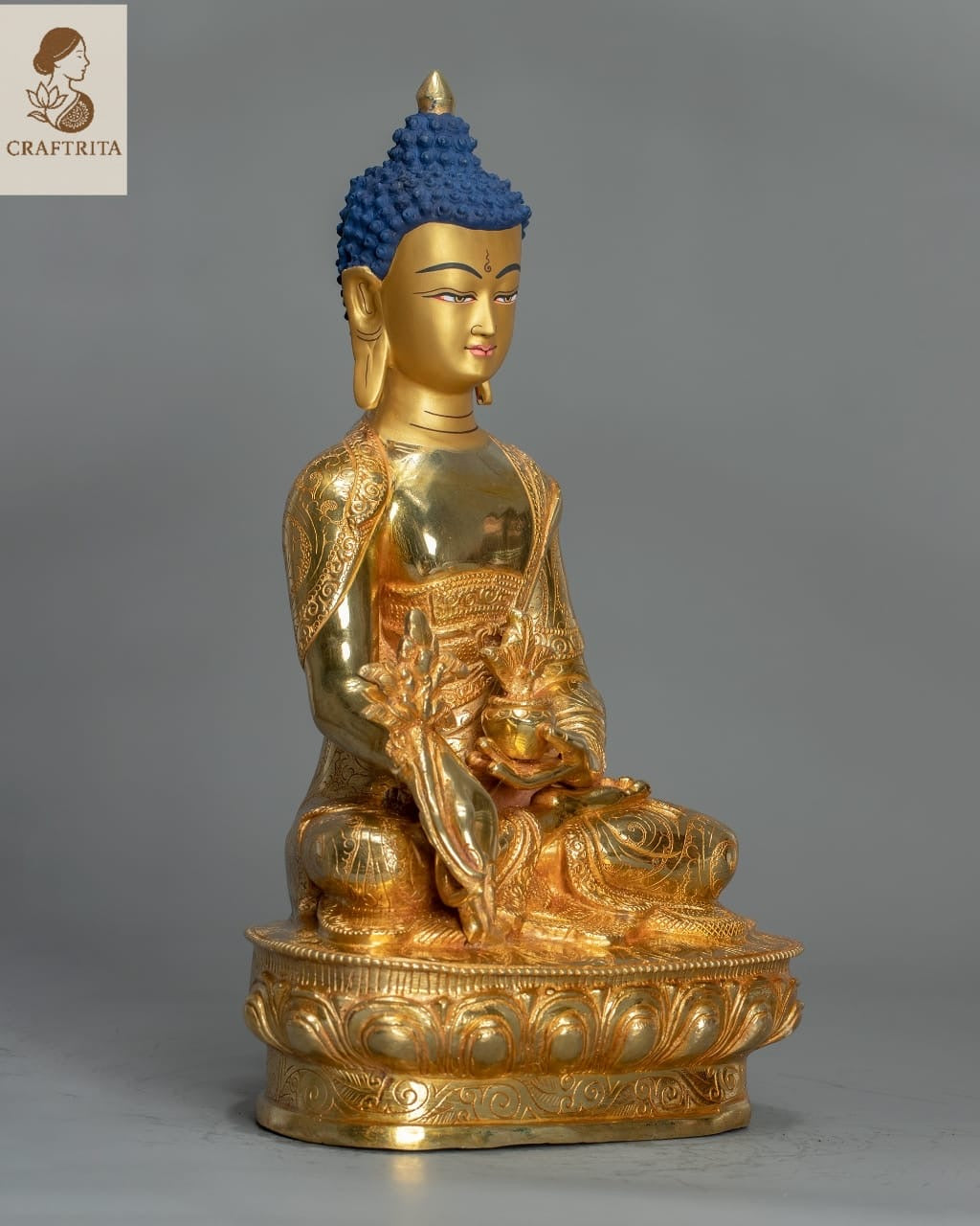 Invite healing, spiritual protection, and well-being into your home with this exquisitely handcrafted Medicine Buddha statue, revered in Tibetan Buddhism as the deity of healing and enlightened medicine. Made from a solid copper body and finished with 24K gold plating using traditional fire gilding, this statue radiates sacred energy and exceptional craftsmanship. It serves as a perfect centerpiece for meditation spaces, personal altars, or as a meaningful spiritual gift.
